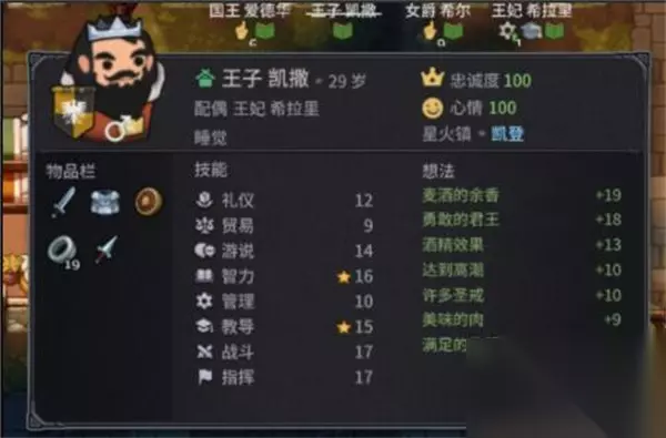关于技能方面 他一般分体系,礼仪+游说,智力+教导,贸易+管理,战斗加指挥。 按照提升的速度来说,战斗和指挥是最容易成长的,智力教导 读书加智培养人才阶段涨到15不难,后期靠属性书能快速提升。 贸易前期通过和商人对话一次+3点慢慢提升,管理让他前期多视察一下建筑,这个涨到15也是最快的,最难的就是礼仪和游说,毕竟精力有限,也是需要后期读属性书提升。 这里面的每一个星号代表特殊技能,按照实用性,战斗是斩首者,这游戏就靠卖领主赚钱。 最有效率的一个是管理,管理官署可以不用纸张,这在前期简直就是神技,一个官署能管20个建筑,不要太香。 其次就是智力和教导的特殊技能,智力是分享书本的概率增大,教导是5%概率新发现天赋(目前还没有成功),其实游说的天赋技能也比较好用,但是游说不好涨所以一般不考虑,贸易礼仪这些都很拉,开局或者后期养成实用性不高。