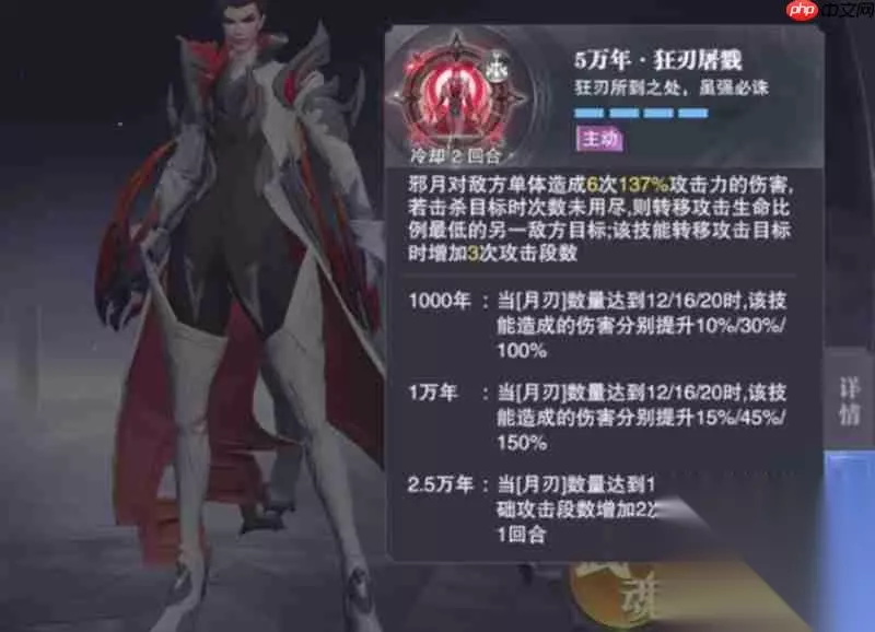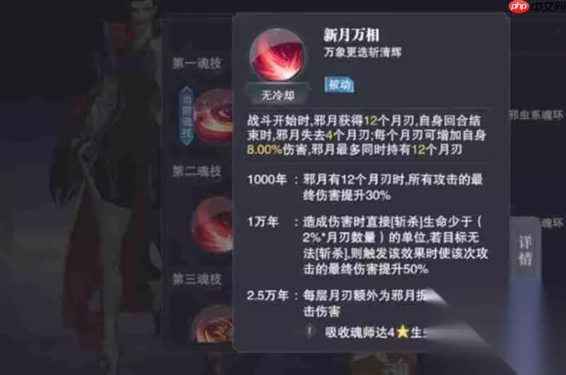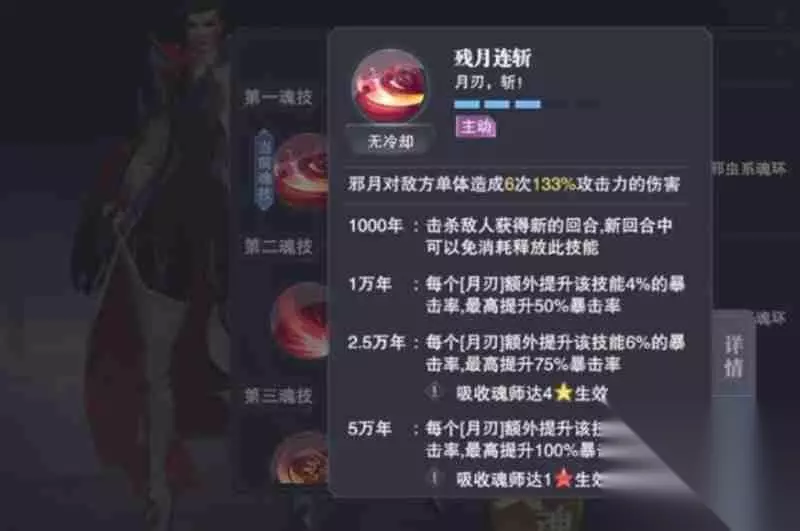残月连斩技能解析 邪月的第一魂技“残月连斩”能够对敌人造成高额暴击伤害,该技能在清理低血量目标时尤为高效。当魂环品质达到1000年时,使用此技能后可立即获得额外行动回合,并提升50%的输出能力。随着魂环年限的增加,5万年魂环版本可使暴击率提升8%,但需要吸收16名魂师才能解锁这一效果。