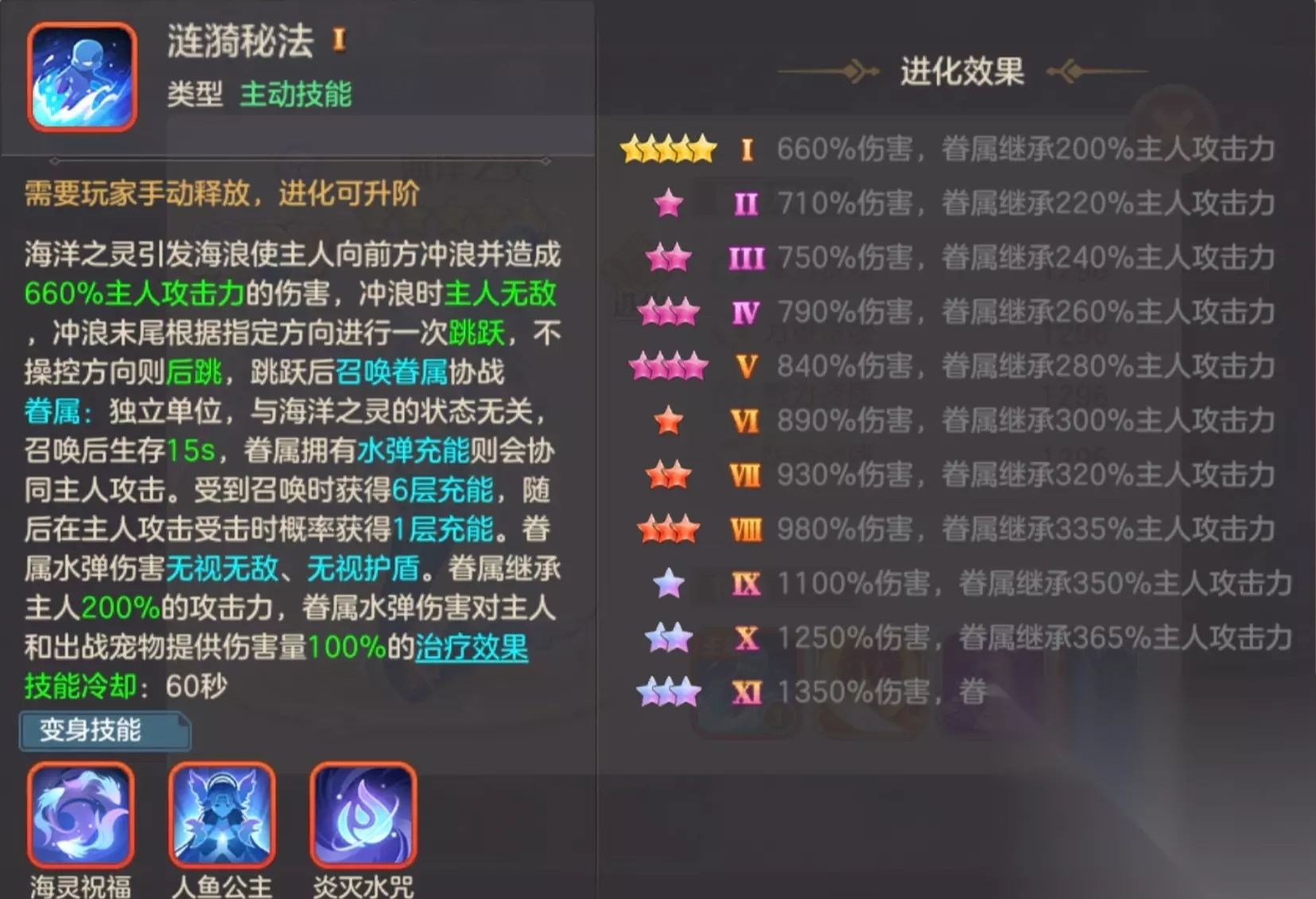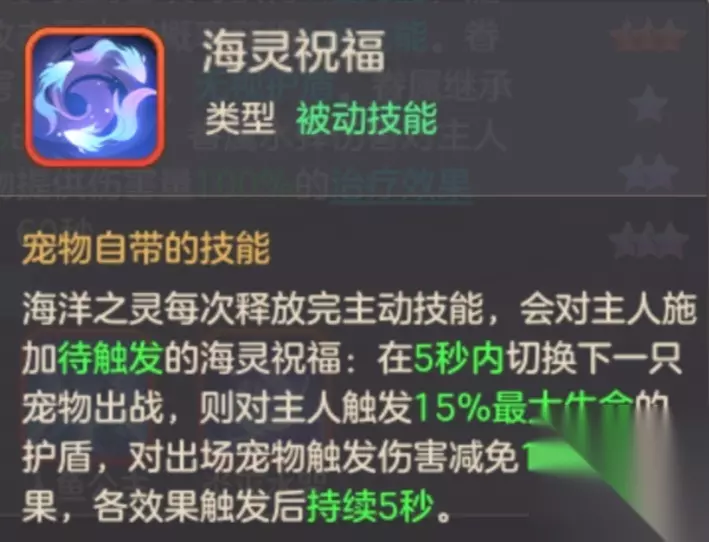 第一被动海灵祝福:技能释放后 5 秒内切换下一个宠物则给主人加持 15% 最大生命的护盾且对切换的出场宠物触发伤害减免 100% 的效果,两个 buff 持续 5 秒。