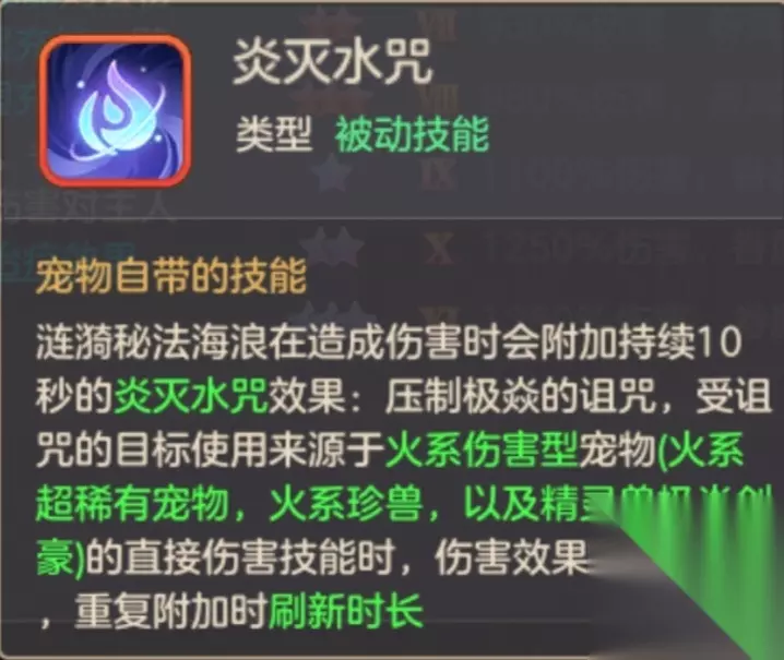 第三被动炎灭水咒:克制一切火系宠物的伤害技能造成的伤害效果降低 80%,效果在技能释放后持续 10 秒,重复附加刷新时长(时间不叠加)。 (注:核心信息就是克制目前主战配置精灵兽极焱剑豪了,也包含老款精灵兽不灭之火,所以海洋之灵也就是替换这两个精灵兽上主战)