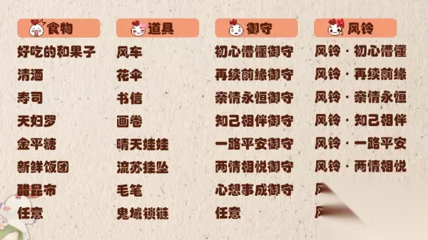 阴阳师缘结历练搭配推荐是最新与君结缘活动玩法,玩家们需要帮助缘结神选好食物、御守和道具组合获取8个风铃喔,那么阴阳师缘结历练搭配什么道具好、阴阳师缘结历练组合选择推荐呢,233乐园手游网为大家带来介绍吧。 *阴阳师缘结历练搭配推荐 缘结历练 *选好外出所要携带的道具,缘结神准备出发喽~ *活动期间,可引导缘结神前往平安京进行结缘,每次返回都可获得丰厚的奖励,当触发特殊组合条件时,更可解锁特殊剧情,并获得专属风铃。 风铃墙 *每当缘结神在缘结历练中见证了一段姻缘,她都会用神力将这段故事封存在指定的风铃中,并挂到神社的风铃墙上继续祝福这段姻缘。 *阴阳师大人们在缘结历练中触发特殊剧情后,可以在风铃墙查看对应的风铃,并获得奖励,集齐全部风铃,更有缘结神的神秘礼物喔! 「缘结历练风铃墙」道具特殊组合列表一览,共有八段剧情等待触发!