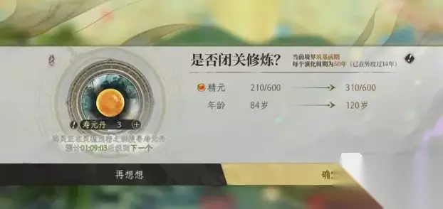 首先,想要提升修为境界,一个循环是:灵气-精元-演化-闭关-寿元。只要能搞懂这几个的关系就能持续增长修为。灵气,可以理解为修为的经验值,决定着能否突破境界,灵气越多属性越高,突破的机会也就越多。这里需要注意的是,灵气条哪怕是满了,暂时不突破也不会浪费,依旧是可以继续积攒灵气的。而灵气主要是来源玩家大世界中的各种奇遇、宝箱、事件,大多数操作都是需要消耗精元的,而精元则只能通过演化来获得,每次演化固定恢复180点。演化的周期是50年,只要精元消耗完毕了,不管是演化周期是否全部流逝,都可以直接闭关恢复精元。所以,不用可以去等,直接把精元用完了就是最优解。不过会面临一个问题,那就是演化也会让主角的年龄不断增长,一旦年龄超过了寿元的上限,那么就无法再演化了。