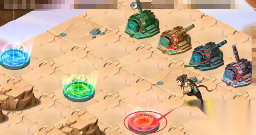 9、随后通过蓝色传送光圈回到中心4个机关地块,操纵4个机关,操纵杆方向分别为“1上,2上,3下,4上”,然后进蓝色传送光圈