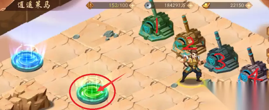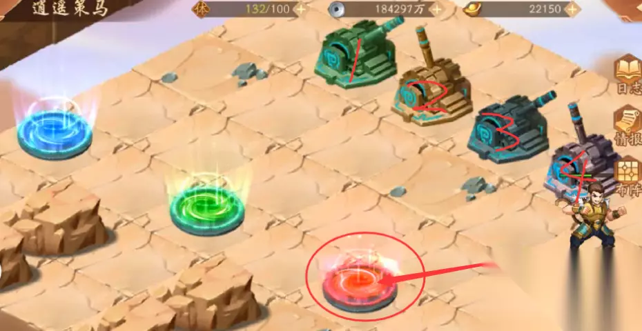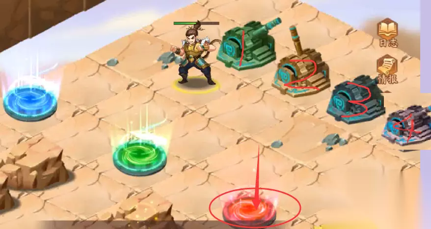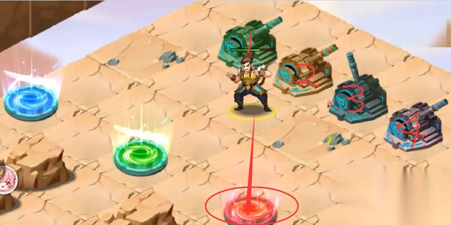 35、随后我们去通过红色传送光圈,传送回到中心4个机关地块,走到4个机关旁边,操纵4个机关,操纵杆方向分别为“1上,2下,3下,4上”,然后进入红色传送光圈