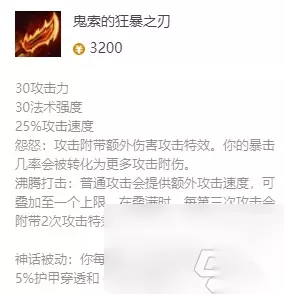 4、【飓风】 +40%攻速、20%暴击几率和7%移速,攻击会附带魔法伤害,平A可以攻击3个目标。另外两个也可以暴击。 5、【盾弓】 加攻击力、暴击几率和生命偷取,提高滑板鞋的伤害。 6、【饮血剑】 加攻击力和生命偷取,当英雄生命值大于70%会获得额外攻击力。