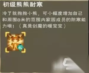 创造与魔法是一款魔法建造类型手机游戏,粉抱抱熊分为五个阶段,每个阶段都有不同的技能,下面就跟小编一起来看看创造与魔法抱抱熊技能详情吧! 兰抱抱熊的最高等级为30级,拥有新技能——初级熊熊耐寒: 可以增加自身和8米内家园成员的耐寒能力(相当于一个持续的I级耐寒buff)。