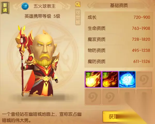 五火球教主是火系魔法英雄,角色等级达到5级便可携带出战,是联盟阵营的初始随从英雄,通过新手任务便可获得,且部落玩家无法获取。 联盟玩家在30级之前,五火球教主的辅助输出基本上是足够的,但他的潜力值较低,不建议深度培养。