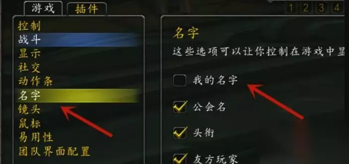 5、最后在界面中找到名字选项,在名字选项里勾选上我的名字,这样就可以显示称号了。