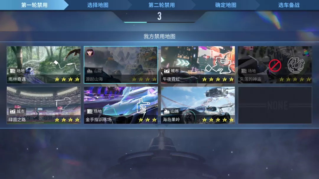 巅峰团队赛:采用车辆禁用,由1号位玩家进行禁用,2、3号位的玩家提供参考建议,在禁用完成后,进行翻牌选车的流程(与排位赛一致)。