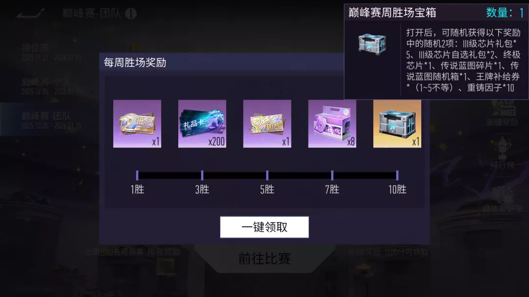 [1]每周达成一定的胜利场次,即可获得巅峰抵分卡、巅峰加分卡以及巅峰赛周胜场宝箱等奖励。