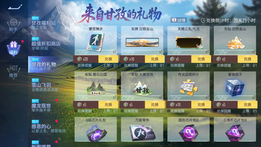 [4] 甘孜的礼物:11月21日~12月18日,快来看看来自甘孜的礼物吧,参与甘孜联动相关活动即可获得“雪峰金币”在这里可以兑换:动作 攀雪舞步车牌 日照金山气泡 天赐之礼联动车贴等好礼,一定不要错过呦~