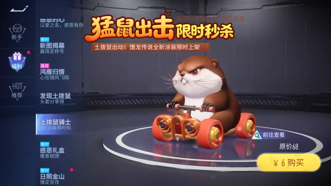[6] 土拨鼠骑士:11月28日~12月18日,猛鼠出击,限时秒杀!饿龙传说全新涂装 土拨鼠骑士联动来袭,超低价限时出售,不容错过(鼠鼠也要开车车!)
