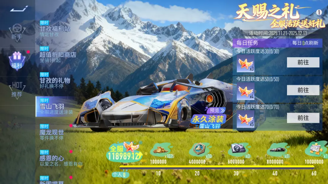 [2] 雪山飞羽:11月21日~12月11日,完成任务为全服进度助力,个人进度和全服进度同时达标后,可领取对应奖励。快来收集活跃星星领全新涂装 雪山飞羽吧~