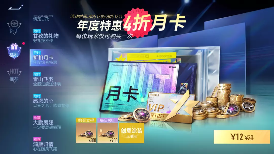 年度特惠,4折月卡12月5日~12月11日,每位车手都可享受4折购买1张月卡,开通月卡后累计可获得纪念币*1200,各位车手不要错过呦~