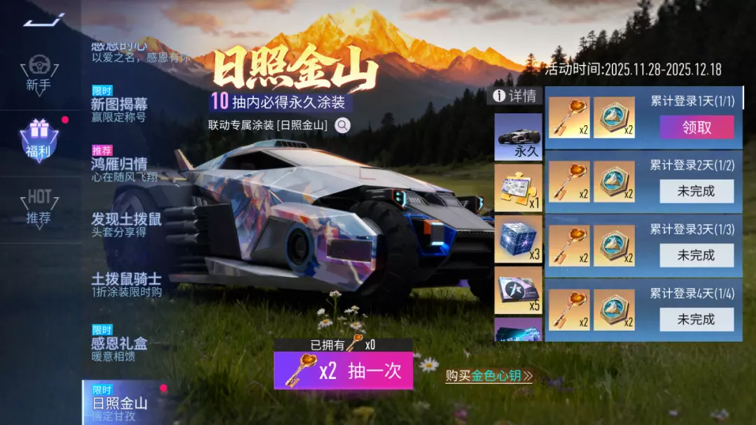 [5] 日照金山:11月28日~12月18日,每天登录速度节即可领取金色心钥、雪峰金币。使用心钥可抽取联动专属涂装 日照金山,10抽必得永久涂装,各位车手记得前来抽取。