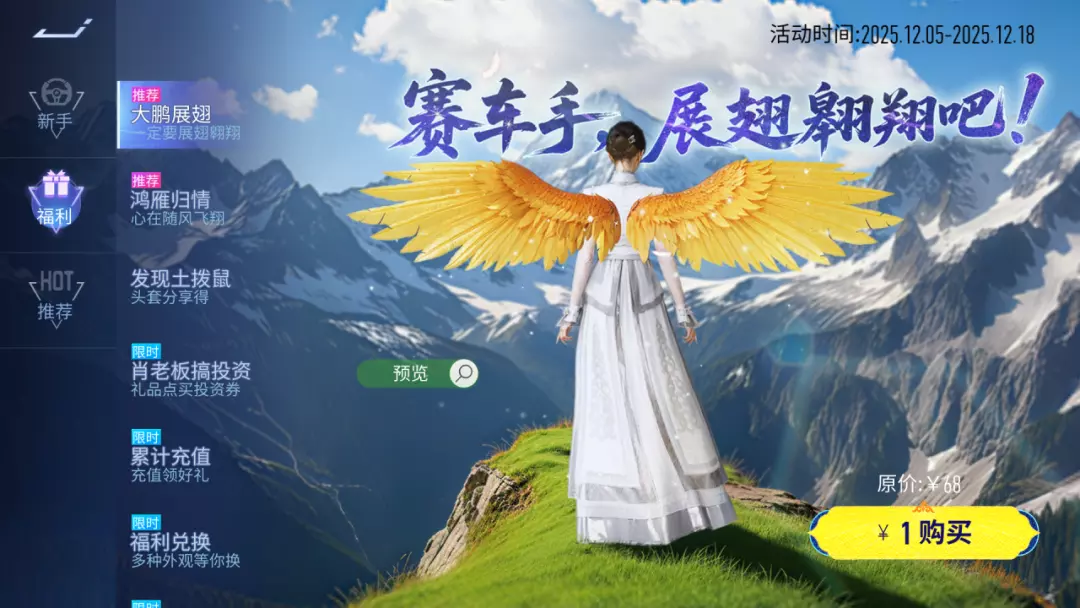 赛车手,展翅翱翔吧!12月5日~12月18日,活动期间只需1元即可获得背饰:大鹏展翅。金色大鹏,霸气展翅!赛车手们快来看看!
