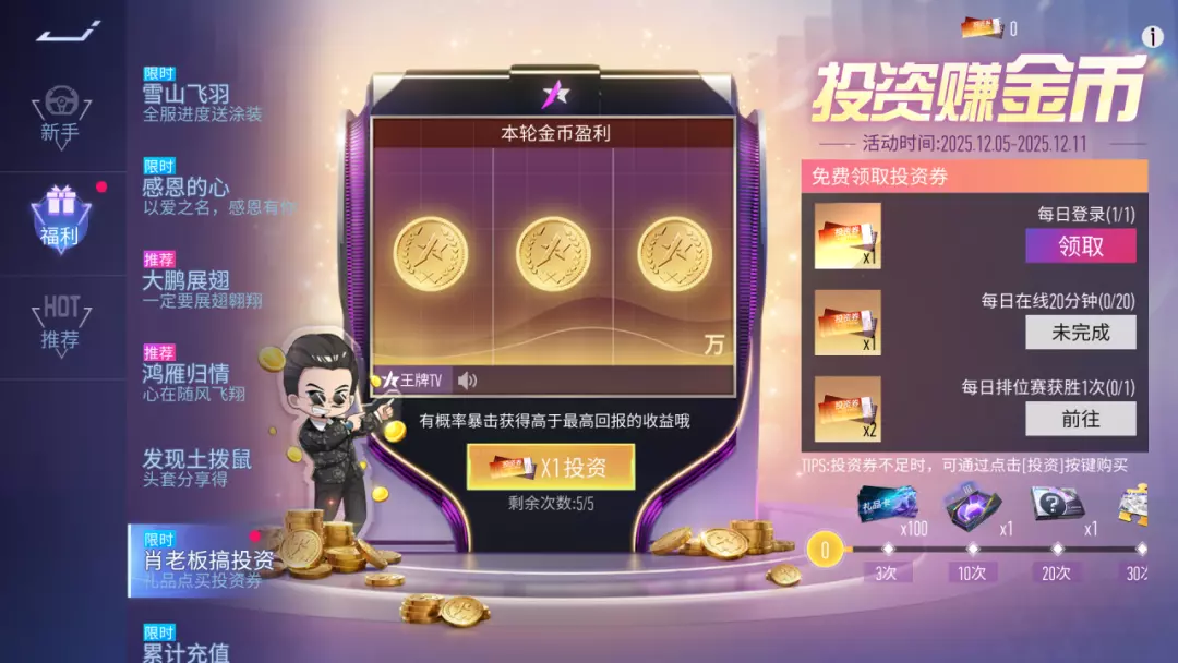 12月5日~12月11日,肖老板又来拉投资了!只需要投资一点礼品点哦!上千万金币大放送,完成任务或直接购买投资券,消耗投资券享超值回报,还有暴击的可能哟~最高30倍回报等你!