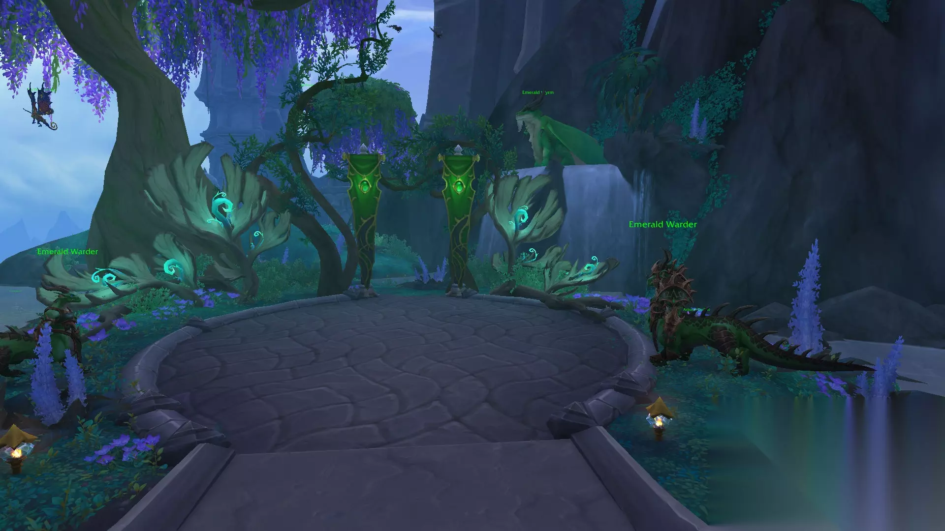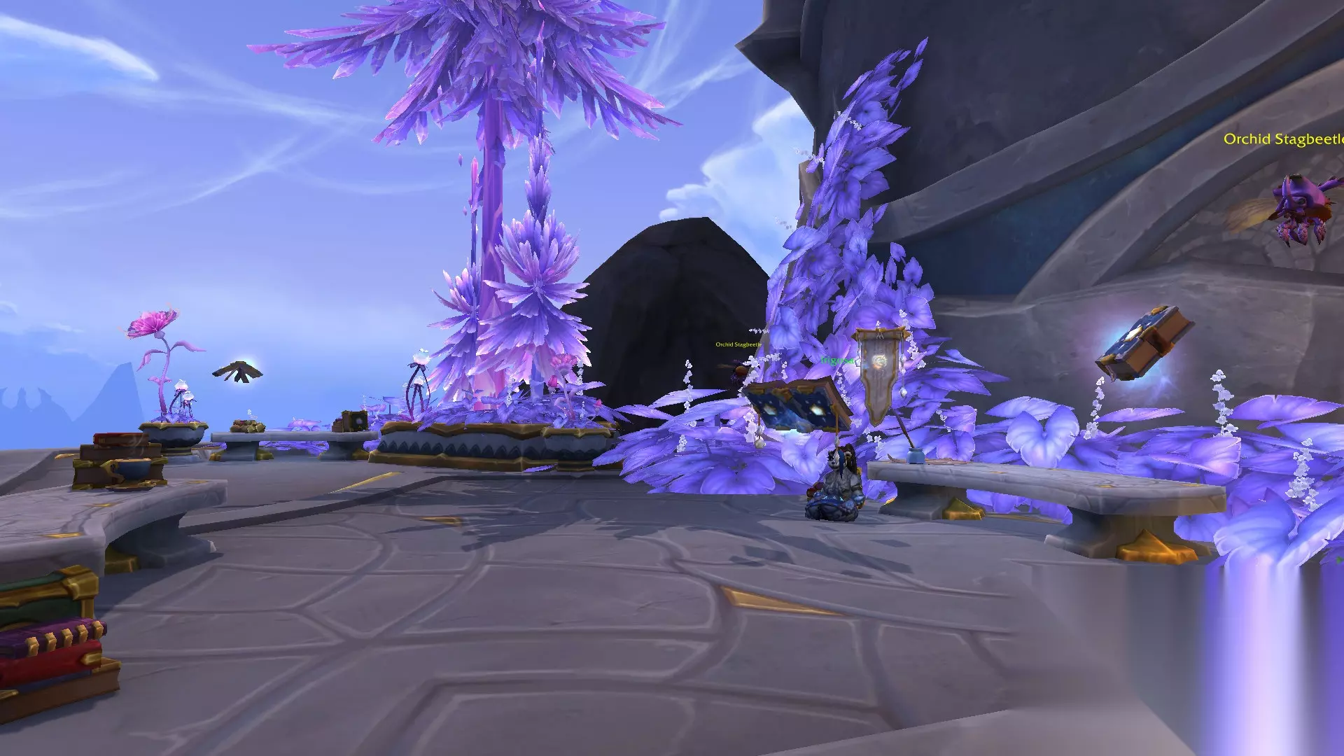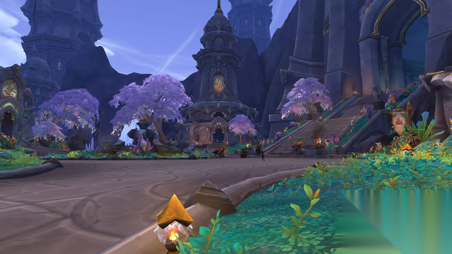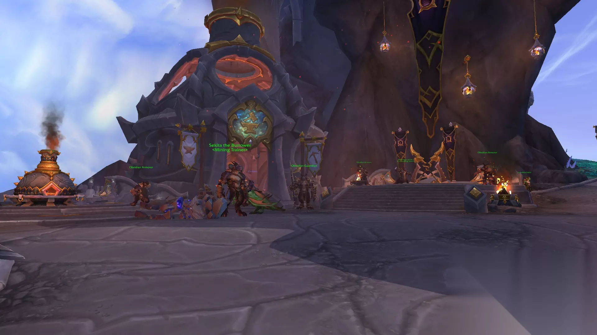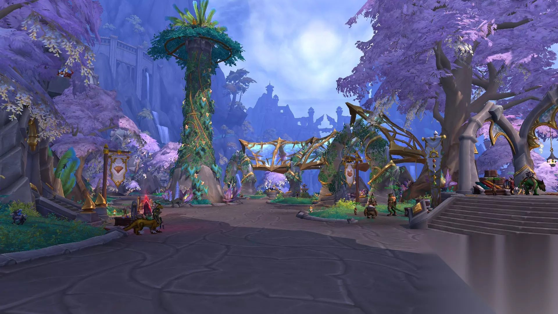 专业技能区那条路向上走是拍卖行、旅店和银行。也是个中央花园,旁边是飞行点。