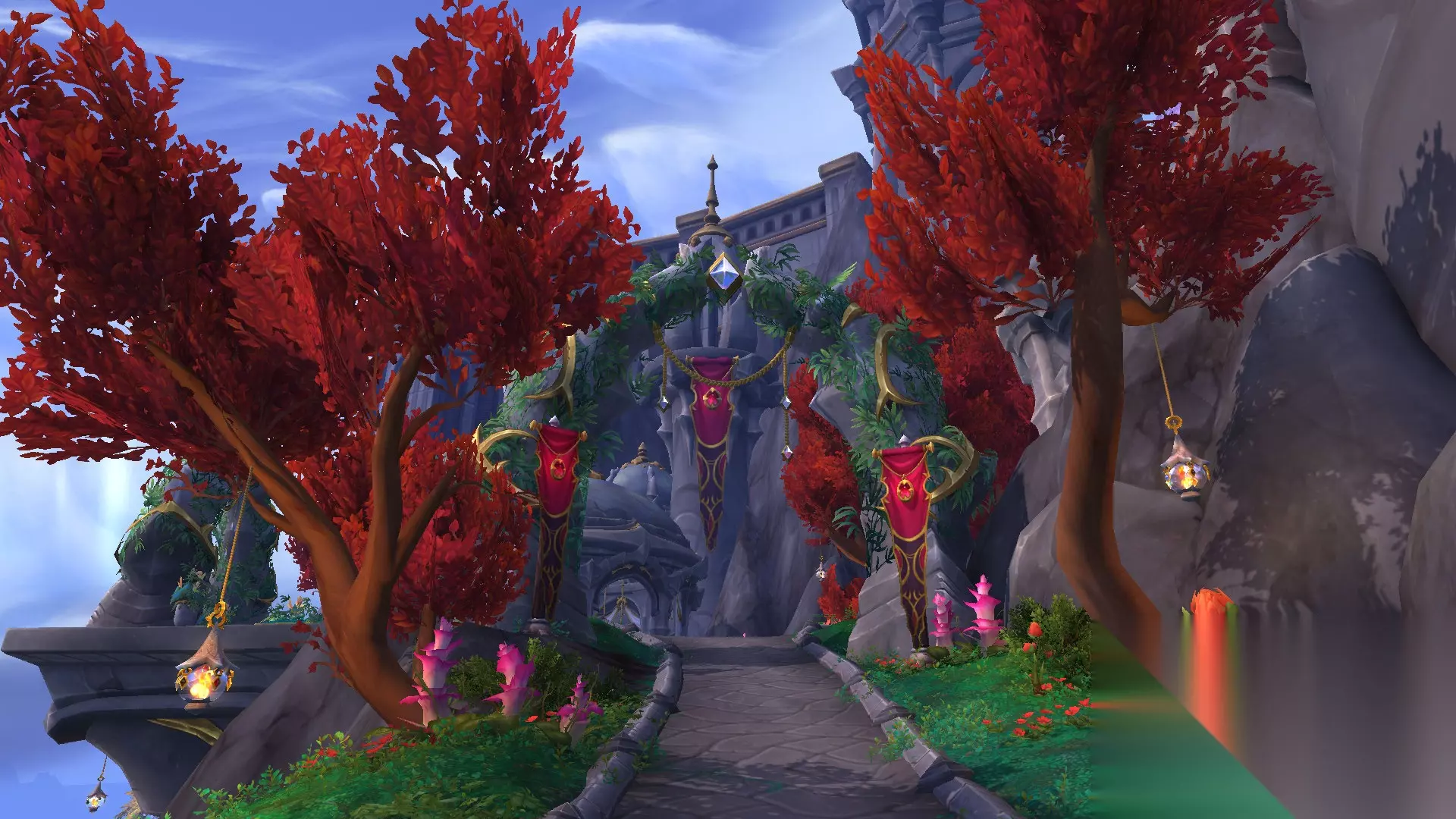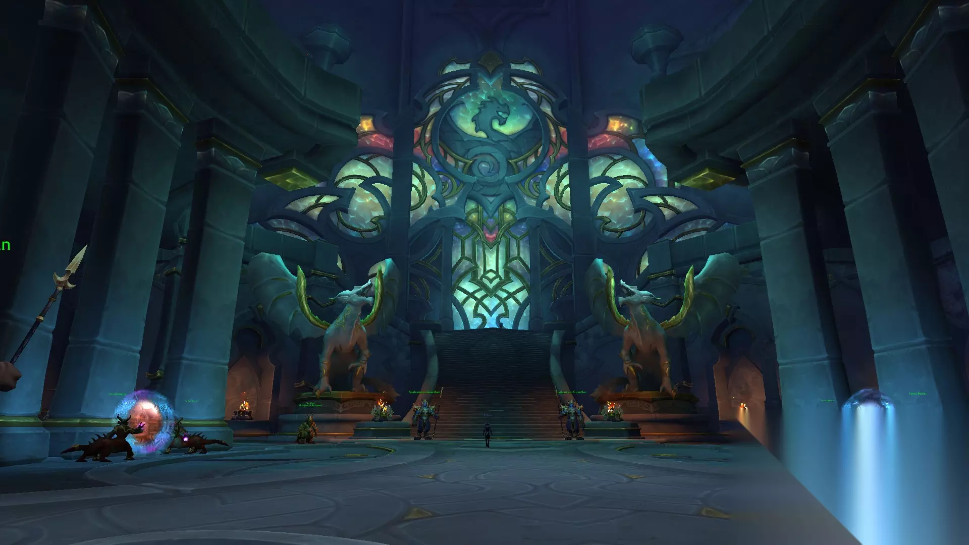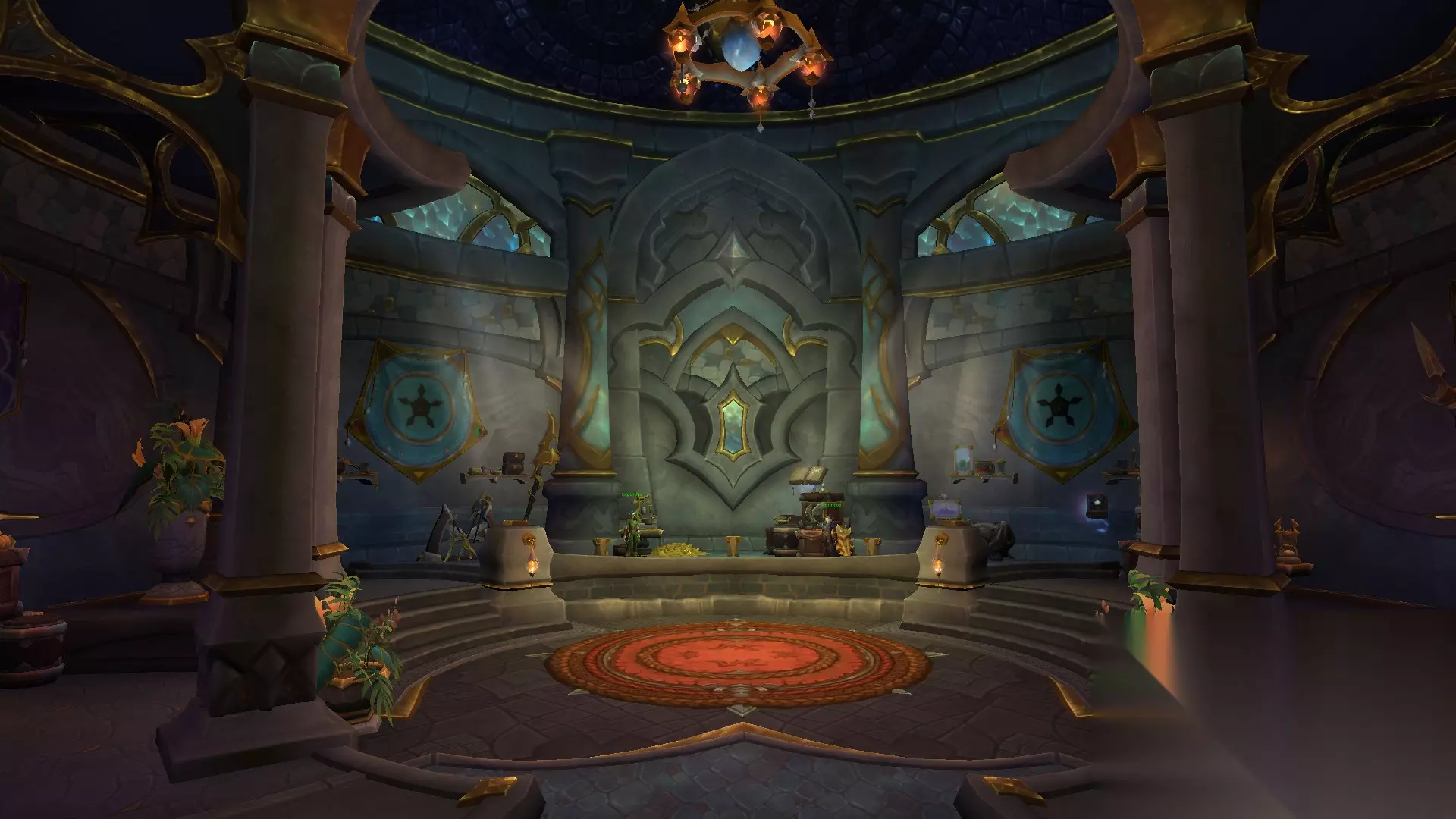 银行旁边的台阶通向城堡,走进城堡大厅可以看到通向暴风奥格的传送门,和非常漂亮的彩绘玻璃。