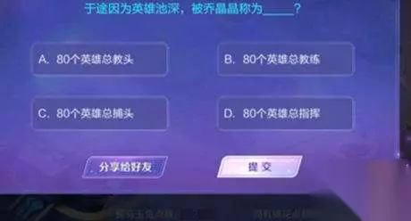 王者荣耀在近期与电视剧《你是我的荣耀》进行了联动,在本次的联动活动中,上线了各式各样的玩法。 其中一个玩法中,有着关于电视剧剧情的各种问题,有一个问题就是于途因为英雄池深,被乔晶晶称为? 答案是:80个英雄教头。 所有彩蛋都只有一次答题机会,答错奖励也就没了。