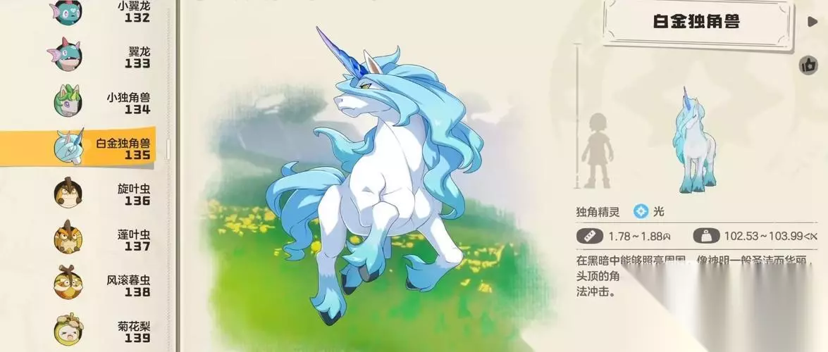 3、白金独角兽 白金独角兽是当前版本中陆地坐骑的速度天花板,拥有全游戏最高的基础移动速率。在开阔地形中骑行时,可实现接近极限的流畅位移体验。该精灵需在游戏进程推进至中后期方可捕获,且成长周期长、培养门槛较高,属于进阶向高投入高回报型坐骑。
