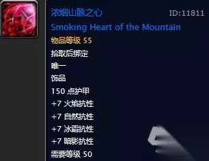 浓烟山脉之心配方 浓烟山脉之心能够增加玩家的150点护甲,以及7点全属性抗性。 属性很适合坦克使用,在前期没有好饰品的时候这是一款不错的提升自己生存能力的饰品,而且造价不算很贵。 浓烟山脉之心图纸掉落地点 浓烟山脉之心图纸的配方由黑石深渊内的精英洛考尔掉落。