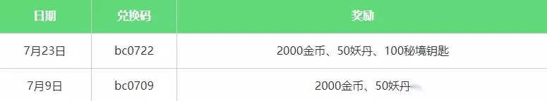 愚人节兑换码(4月): 兑换码:EZJ4321 请在2023年7月1日23:59前兑换 兑换码:YRJ4141 请在2023年7月1日23:59前兑换 兑换码:YRJEZJ41 请在2023年7月1日23:59前兑换 往期兑换码: 新年礼包兑换码:JCXNKL11 兑换码有效期:2023年3月31号 兑换码1:jcslgzh 兑换码2:jcsl2022——铜钱*1888,妖丹*50 兑换码一:guafen1 奖励内容:小型体力宝瓶*1,烛龙灵魄*5,铜钱*3000; 兑换码二:jiama99 奖励内容:25化身点+100妖丹; 兑换码三:hxx0830 奖励内容:铜钱*2000,妖丹*50,秘境钥匙*50; 永久兑换: 兑换码一:dy666(2000币50魂50钥匙) 兑换码二:buchang(7000铜币,50妖丹,50钥匙) 兑换码三:qquandhm(7000铜币,50妖丹,50钥匙) 兑换码四:jcsl2022(铜钱*1888,妖丹*50) 7月最新兑换码