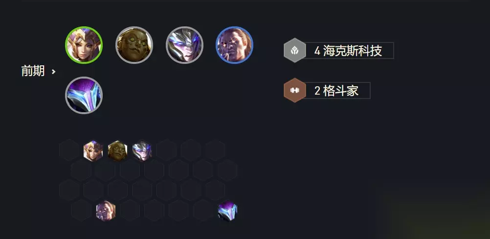 海克斯羁绊增加护盾以及魔法伤害,且一二费棋子众多,所以选择海克斯非常的经济、战斗力又强,还能快速二星。 前期选择猪妹、俄洛伊、皇子、卢锡安、梦魇或者乌鸦出来,这样可以组成四海克斯的羁绊,容易锁血以及拿到经济。