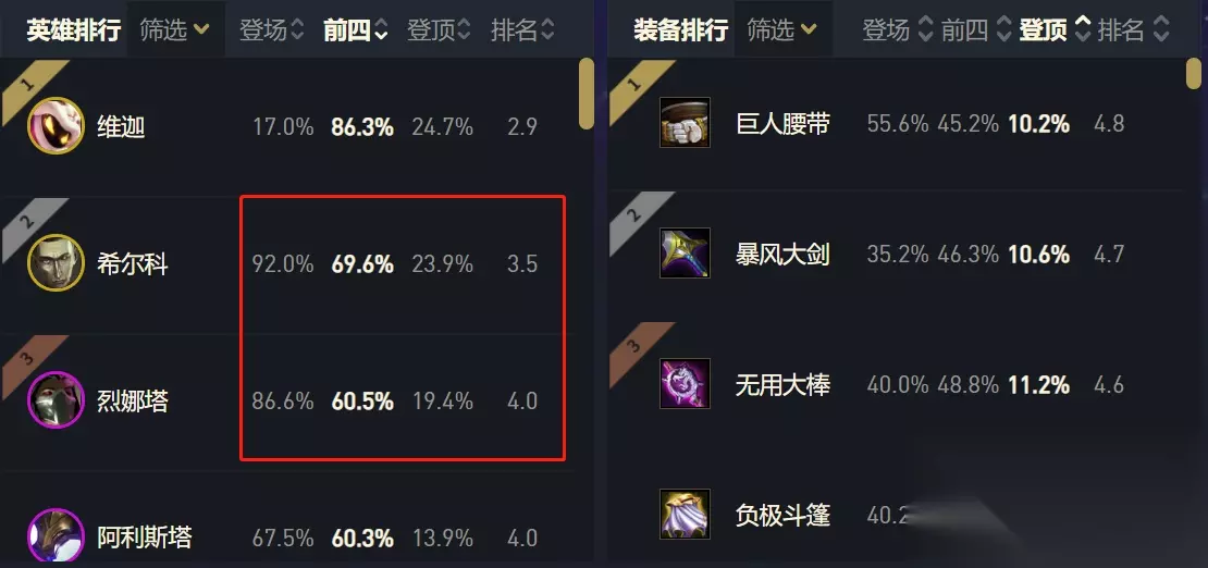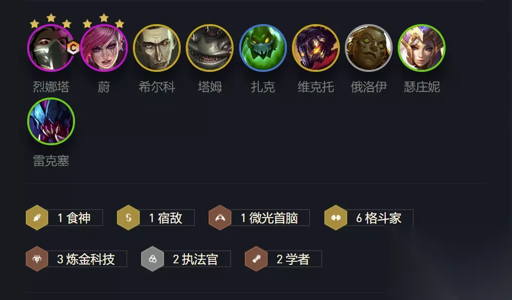 炼金斗士阵容强势登顶,S级阵容成型就能吃分 阵容组成分别是烈娜塔、蔚、希尔科、塔姆、扎克、维克托、俄洛伊、猪妹、挖掘机。 组成羁绊是六格斗家、三炼金、两个执法官、两个学者、一个微光首脑、一个宿敌、一个食神。 这是一套高费卡的运营模式,非常吃经济、同时为了阵容成型,也对连胜要一定的要求。为了累计经济、为了让血量支撑到阵容成型,前期一定要选择打工棋子战斗力强、容易合成二星的阵容,在这里首推“海克斯”阵容来前期打工。