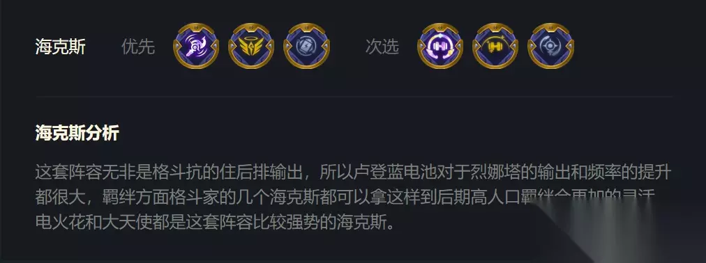 实战方面:这套阵容后排既然负责输出,那么后排太脆就给了“刺客”阵容机会,为了修缮这个缺点,玩家可以把一个斗士放在最后排吸引刺客的火力,一个吸引不了可以放两个,记住,遇到刺客阵容一定要舍弃两个棋子放后排吸引火力,为烈娜塔与蔚争取时间。 笔者观点:这套阵容是高费卡运营阵容,战斗力有保证,同时前中期运营很重要,因此,前期推荐打工战斗力强,合成二星难度不大的海克斯过度,在后期8阶段可以尝试搜索4费卡、五费卡棋子,当然一切以保证血量为前提。
