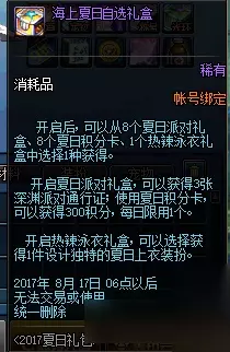 DNF2017夏日礼包上架了,玩家们购买礼包后,会得到一个海上夏日自选礼盒,很多人都不知道里面可以开出什么,今天小编就给大家介绍一下DNF海上夏日自选礼盒内容,一起来看看DNF海上夏日自选礼盒里有什么吧! 海上夏日自选礼包 开启后,可以从8个夏日派对礼盒、8个夏日积分卡、1个热辣泳衣礼盒中选择1种获得 夏日派对礼盒: 开启夏日派对礼盒,可以获得3张深渊派对通行证; 夏日积分卡: 使用夏日积分卡,可以获得300积分,每日限用1个。 热辣泳衣礼盒: 开启热辣泳衣礼盒,可以选择获得1件设计独特的夏日上衣装扮。