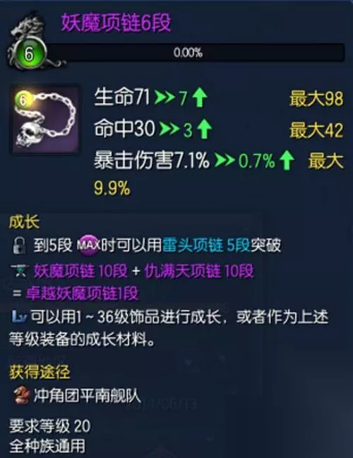 当我们把第一件装备成长到了10段线留着,再重新做一个一直做到6段,再把升好的10段项链用来喂6段的可以直接成长到10段。