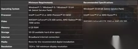 PC配置要求: 操作系统:Windows 7/ Windows 8/Windows 10 64位 CPU:Intel Core i3 或 AMD Phenom X3 8650 显卡:NVIDIA GeForceR GTX 600 series 或 AMD Radeon HD7000 series 内存:6GB RAM 硬盘空间:50GB