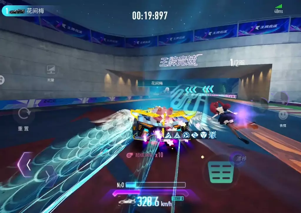 这是《王牌竞速》的赛道实战内容,展示了在“风落过隙”赛道的竞速过程,玩家驾驶赛车运用氮气大招、紫喷、惯性手刹等技巧,还触发了集气、充能等赛道效果,最终跑出59秒的成绩。