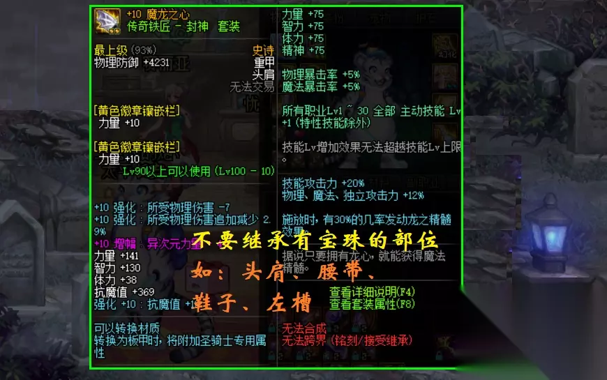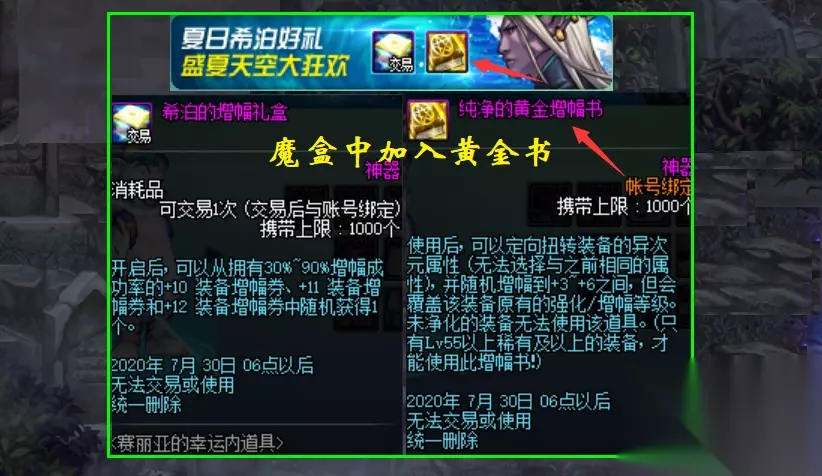 由于100级版本有了继承系统的存在,1本黄金书等于1张增幅保护券的说法就正式成立了! 当然了,话虽然这么说的,但依旧不推荐大家为了黄金书而去开魔盒,开出黄金书几率姑且不谈,就算让你开出来了,你还需要增幅10,还需要再冲击11/12,然后还要顶掉史诗上面的附魔,这么多精力投入难道就只是为了几十点力量而已?那也未免太奢侈了。