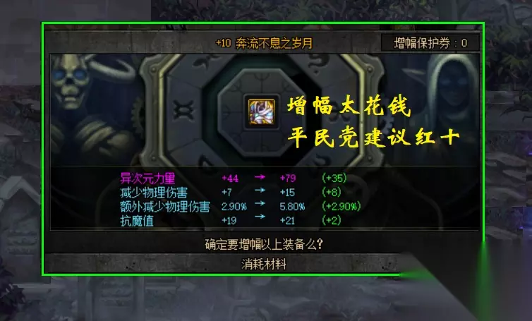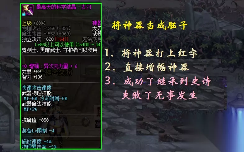实际操作如下:玩家可以从各渠道获得许多的100级神器/传说装备,然后将其打上红字,直接开始增幅,增幅成功了就将打造继承到史诗装备上,如果增幅失败了就让它直接碎掉,如此,即可免除了增幅保护券的费用。 而且在增幅过程中,还可以选择使用很多的红字装备一起增幅,相当于起到了一个胚子的作用,和传统胚子不同,由于这些神器/传说装备都可以继承到史诗上,所以不管哪一件成功了,最后都可以用来继承,这样的话成功几率也会相对提高不少。