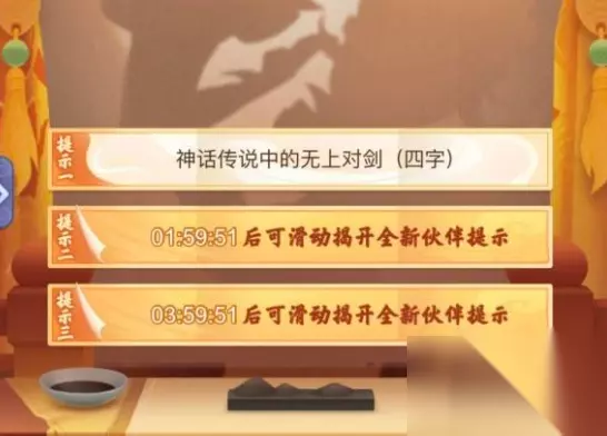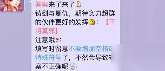 2、填写时候留意不要增加空格或者特殊符号,不然会导致答案不正确,竞猜奖励为5000勾玉。 3、全新金色伙伴干将莫邪即将上线,属性和技能都是十分不错的哦,大家拭目以待吧。 梦幻西游神话传说中的无上对剑四个字答案就介绍到这里,如果对您有所帮助,不妨转发给其他需要的玩家,更多相关攻略正在添加中。