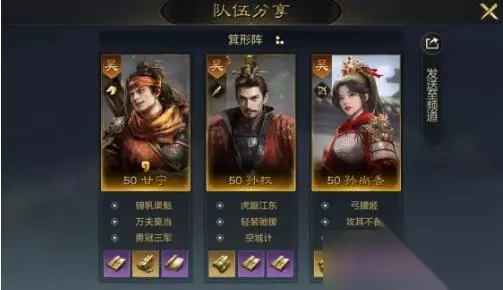 三国谋定天下吴国怎么搭配完美阵容介绍 阵容一: 成员:孙权+甘宁+孙尚香 特效:吴国阵营提供10%的全属性的加成。 配阵: 1、孙权:轻装驰援+空城计 2、甘宁:万夫莫当+勇冠三军 3、孙尚香:攻其不备+千里突袭