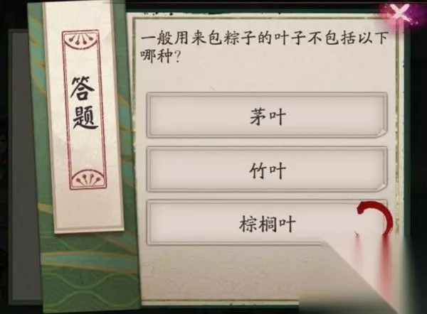 师端午节每日答题包粽子的叶子不包括以下哪种阴阳师的端午节轰动每天都会出上一体有趣的题目答对后就能获得不错的奖励,今天的题目是粽子的叶子不包括以下哪种,想知道的小伙伴快一起来和我看看吧。