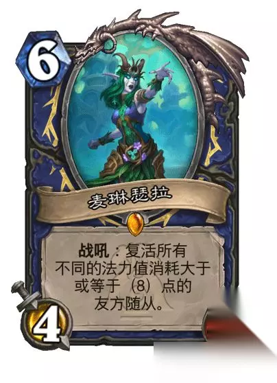 萨满卡牌: 传说随从,6费4/4 战吼:复活所有不同的法力值消耗大于或等于(8)点的友方随从。