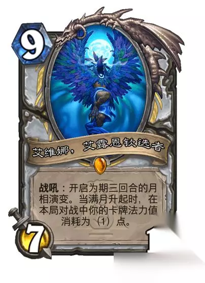 牧师卡牌: 传说随从,9费7/11 (荒野之神) 战吼:开启为期三回合的月相演变。当满月升起时,在本局对战中你的卡牌法力值消耗为(1)点。