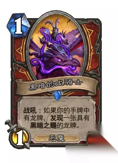 稀有随从,1费1/1 恶魔 战吼:如果你的手牌中有龙牌,发现一张具有黑暗之赐的龙牌。