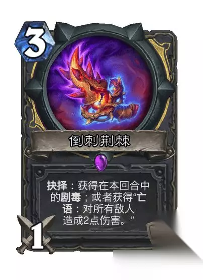 盗贼卡牌: 史诗武器,3费1/3 抉择:获得在本回合中的剧毒;或者获得“亡语:对所有敌人造成2点伤害。”