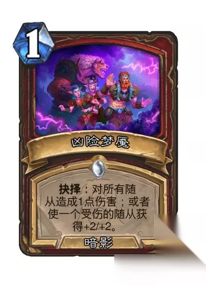 战士卡牌: 普通法术,1费 暗影 抉择:对所有随从造成1点伤害;或者使一个受伤的随从获得+2/+2。