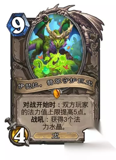 【漫游翡翠梦境汇总】 漫游翡翠梦境新卡 中立卡牌: 传说随从,9费4/12 龙 对战开始时:双方玩家的法力值上限提高5点。战吼:获得3个法力水晶。