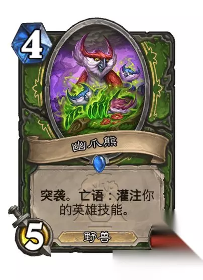 猎人卡牌: 稀有随从,4费5/2 突袭。亡语:灌注你的英雄技能。