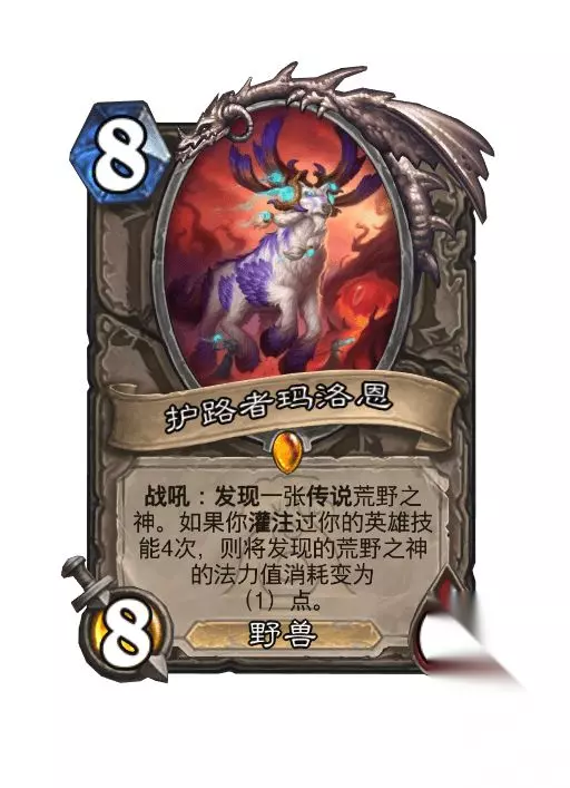 传说随从,8费8/6 野兽 战吼:发现一张传说荒野之神。如果你灌注过你的英雄技能4次,则将发现的荒野之神法力值消耗变为(1)点。