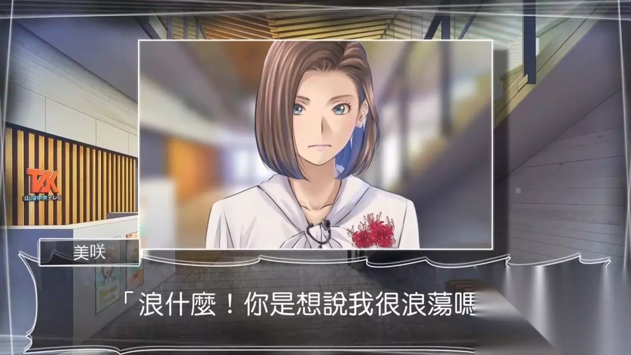 巫女人设好评 获得『三花猫护符』与『神签』 从女生的谈论声中,得知金猫护符很难得的样子,询问老爷子: √金色猫咪 小云的抽签结果 老爷子离开神社后,主人公考虑接下来该前往的场所,突然想到之前净纸上浮现出的字样,查看观光导览得知地图北边有山阴中央电视台。 移动至TSK山阴中央电视台,该怎样见到主播村上美咲呢?询问柜台小姐: 想当主播 √想见美咲 假称自己是美咲的朋友,对方要求报上大名: 我是神在庵。 我叫由香里。 我叫渡边。 √我叫野津。 然而美咲并不在位子上,报名也没用,调查一下柜台前第二张海报,传来了争执声。 一位女主播与上司因为工作分配问题发生了一点争执,从话语中得知她与生活辅导课的眼镜仔是高中同学,争执结束后询问女主播: 是不是村上美咲 获得肯定的答复后,正准备继续询问,对方却产生了戒意,原来野津曾告知相关事件,硬着头皮问吧: √文野亚弥 不错的旅馆 今天的天气 直接问询对方矢口否认,那么再深入一点吧: 喜欢的食物 不错的旅馆 今天的天气 √十五年前的笔友 略有成效,但是提到话最多的浪浪这个绰号时,美咲突然恼怒了起来,奇怪的是对方也知道主人公Max的绰号,同时下达了逐客令。