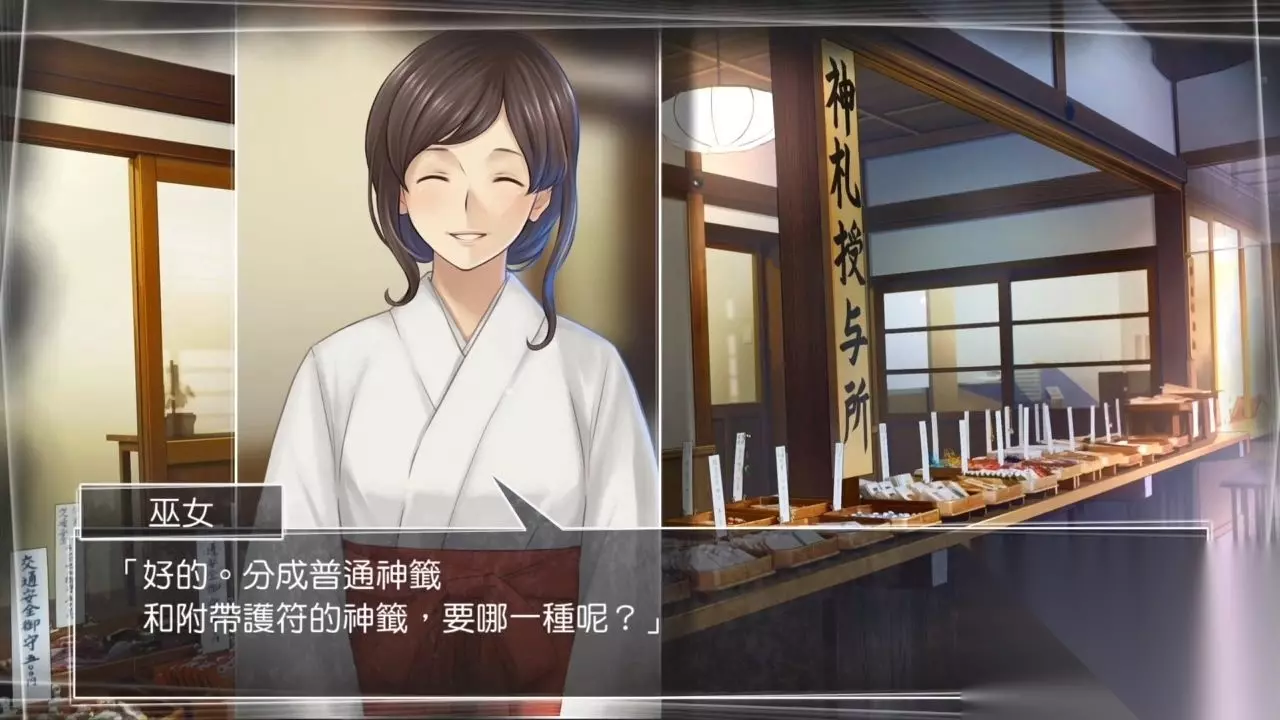 购买良缘占卜净纸 获得『良缘占卜的净纸』 移动至镜池,从持有物品里选择良缘占卜的净纸,与老爷子一起进行占卜,浮在水面上的净纸浮现出『北方 吉』的文字。 继续调查镜池水面,老爷子又要求一同去抽神签,没办法,移动至社物所。 向巫女发问: √神签 巫女服 购买了附带护符的神签,抽出的那袋里面装有三花猫护符,运势虽是大吉,然而上头的内容确让人高兴不起来。