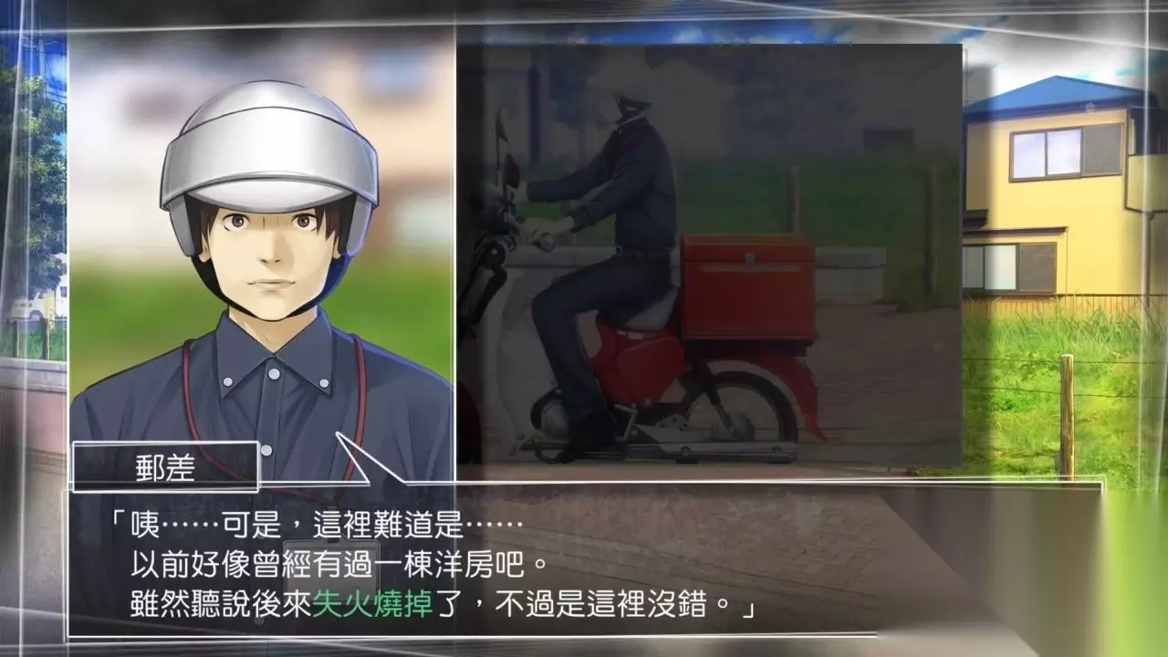 手机当中可以存档 已经确认了住处所在,点击菜单中的移动至文野家。 到达地图显示的地点,然而眼前没有任何建筑物,只有一片围栏围起的空地。调查围栏,一位邮差正好路过。使用询问指令问询,点击持有物品,将没盖邮戳的信封呈递过去。从邮差口中了解一个惊人的事实:这处空地原先有一栋洋房,但在十五年前失火烧光了,也有人因此丧生。